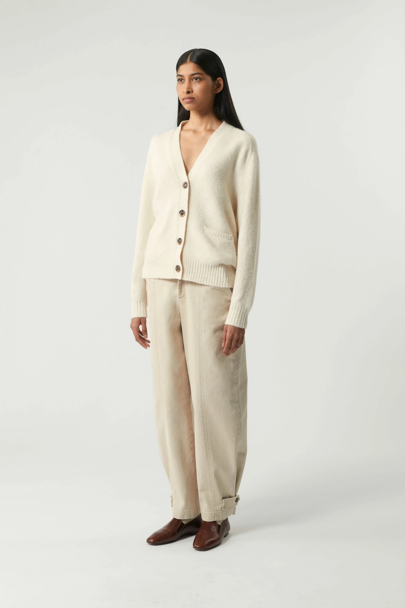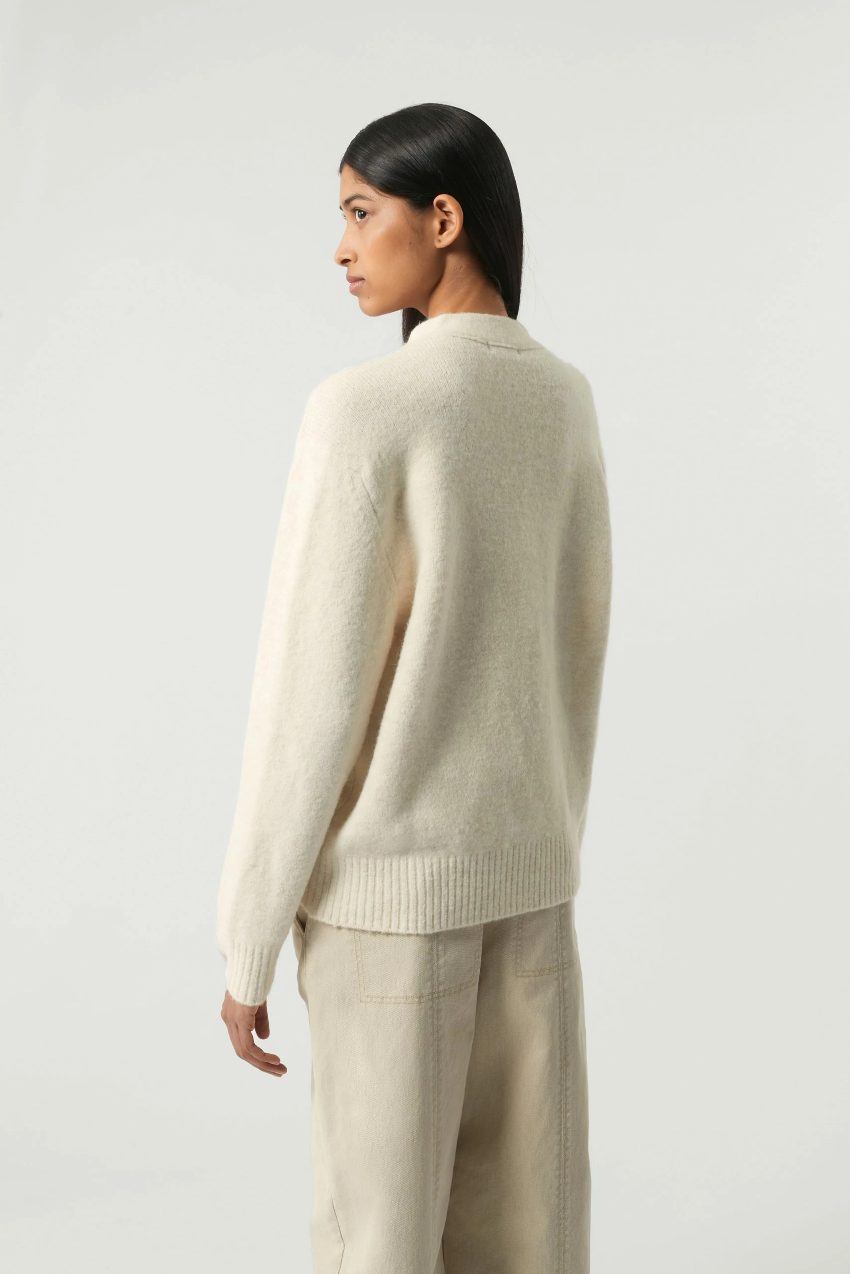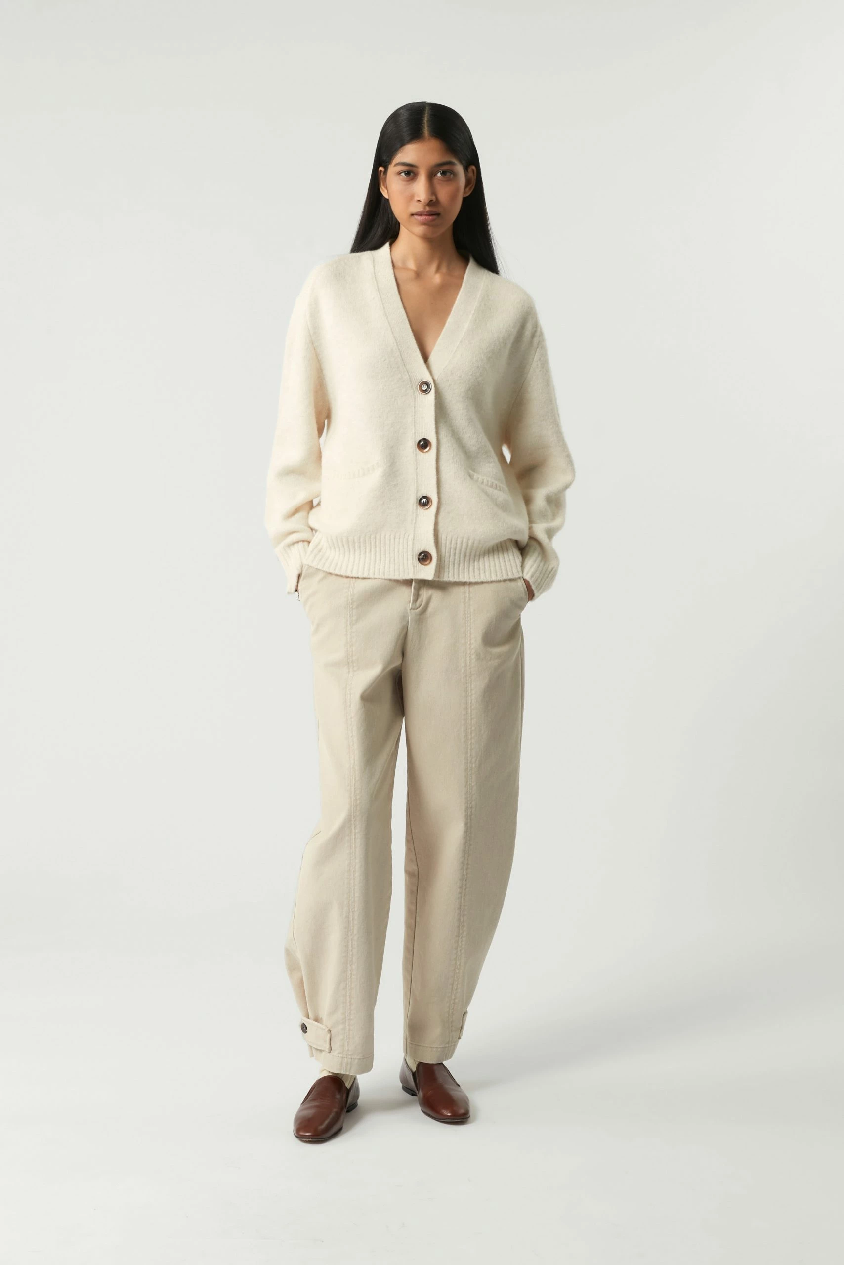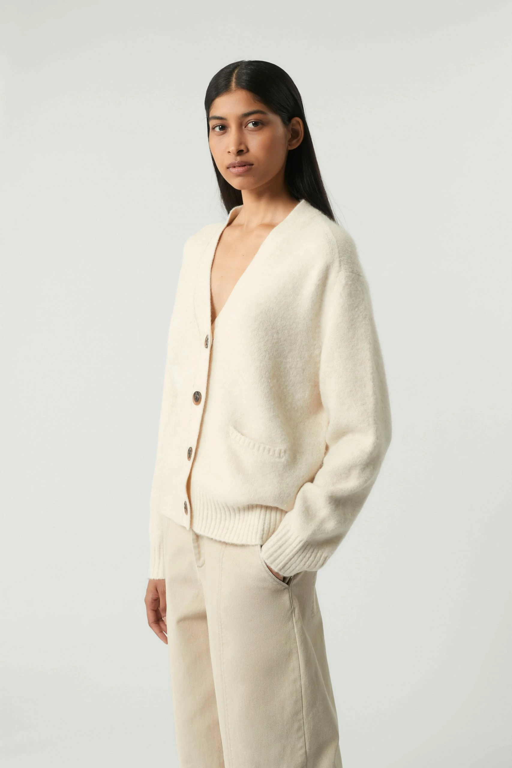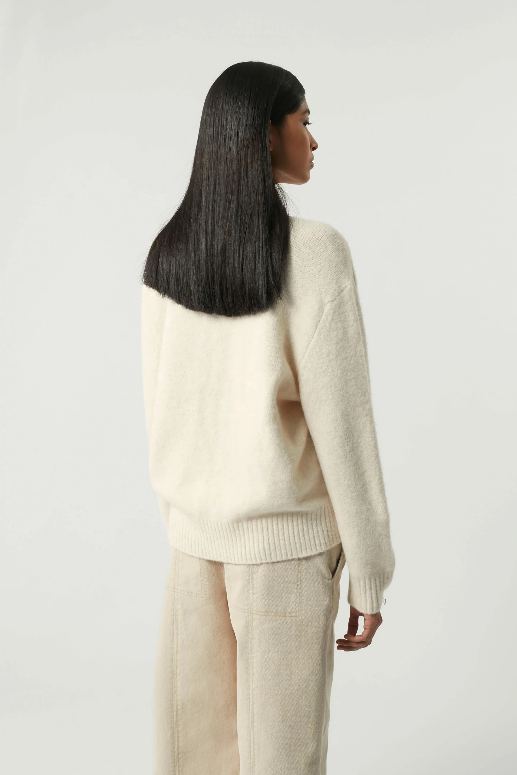Sergio est un cardigan oversize emprunté au vestiaire masculin. Il possède une forme ample, un col V et deux poches fendues intégrées dans la maille. Il peut se porter seul ou en superposition au dessus d’un tee-shirt col roulé par exemple.