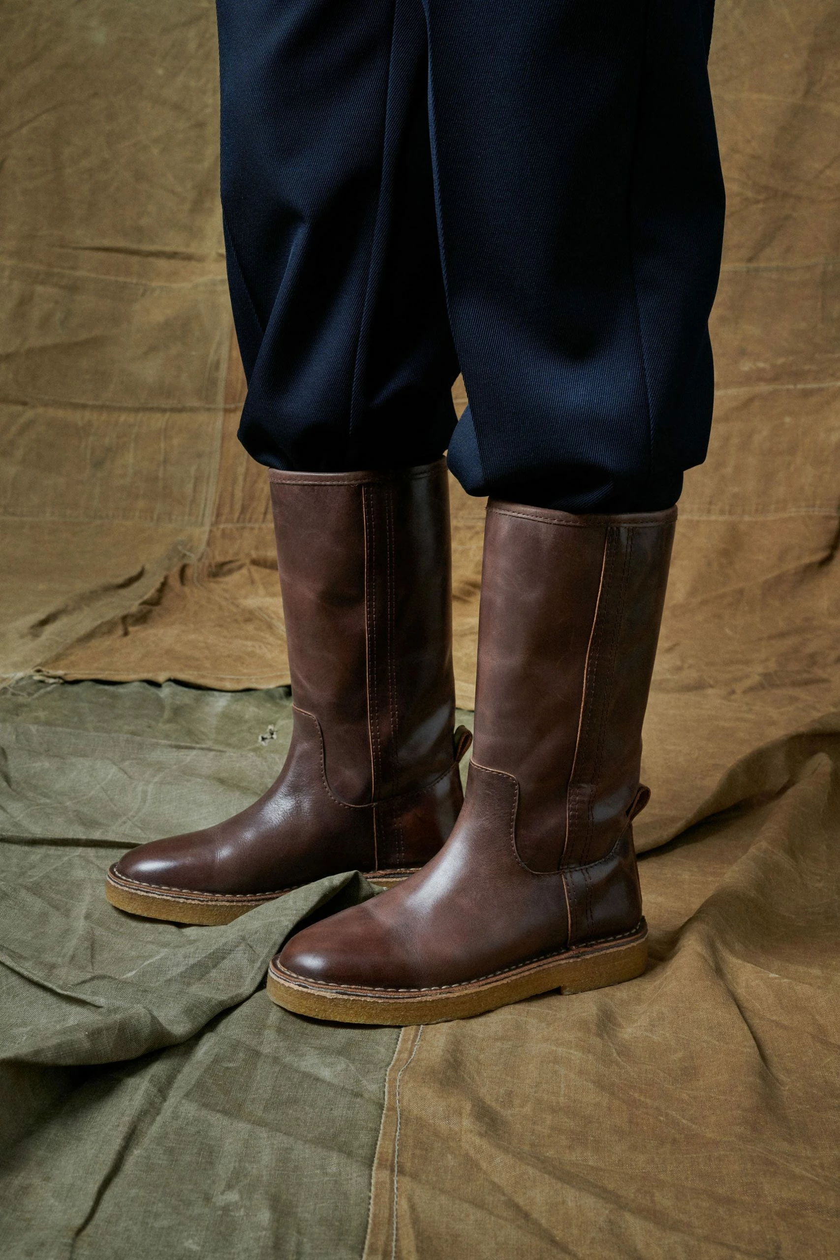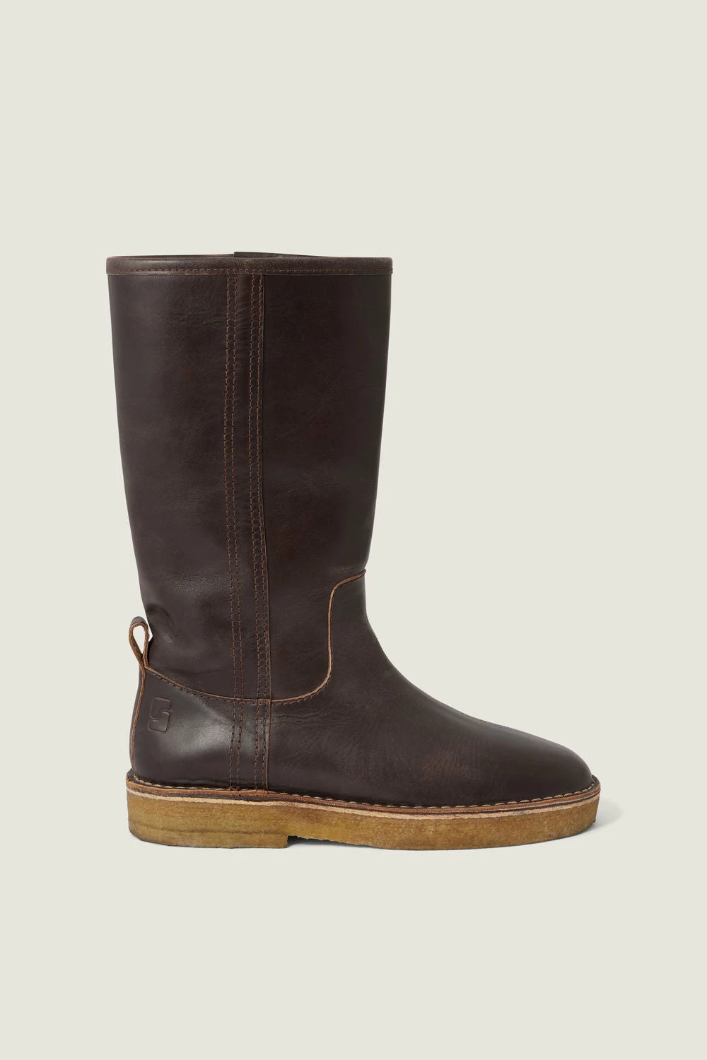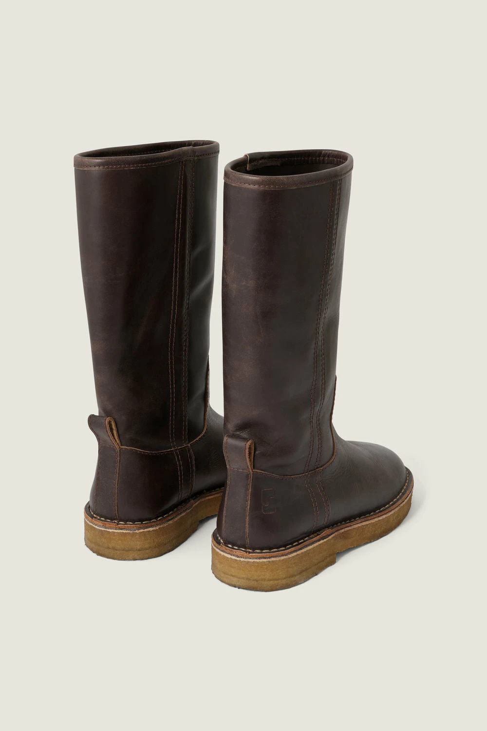 Sauvage est une nouvelle botte haute faite dans un cuir épais qui se patinera avec le temps. La semelle épaisse est en crêpe dans une couleur contrastée. Sa forme large la rend pratique à enfiler et permet aux pantalons de se rentrer facilement dedans. Elle peut aussi se porter avec des pièces plus féminines telles que des robes et des jupes.