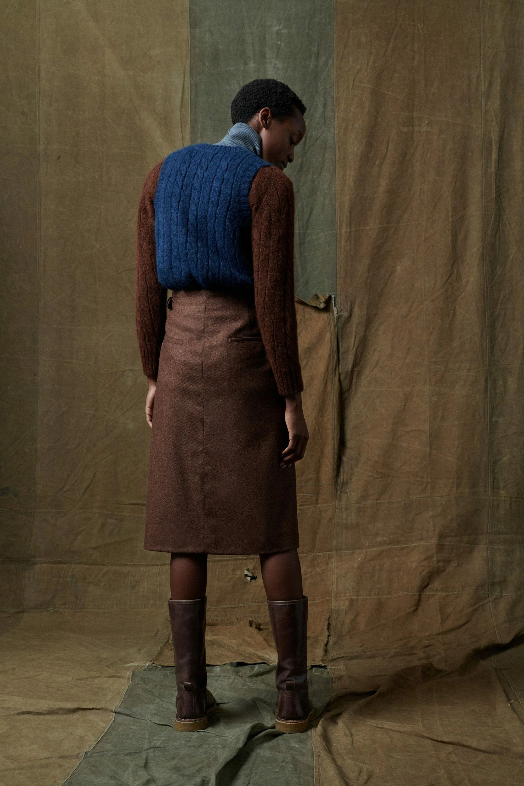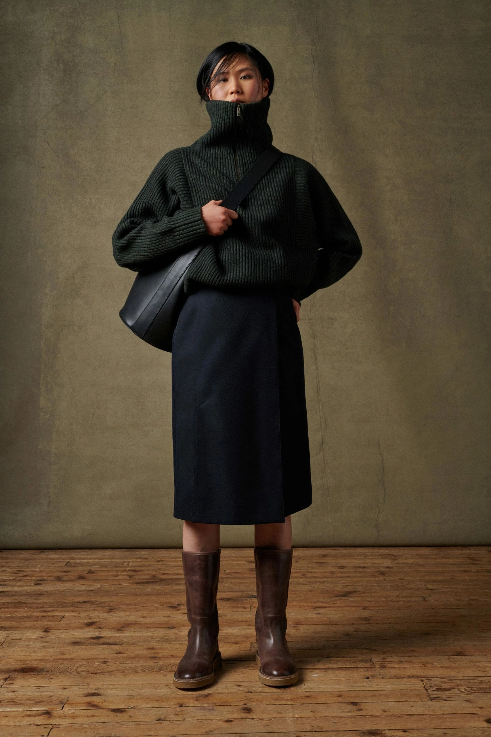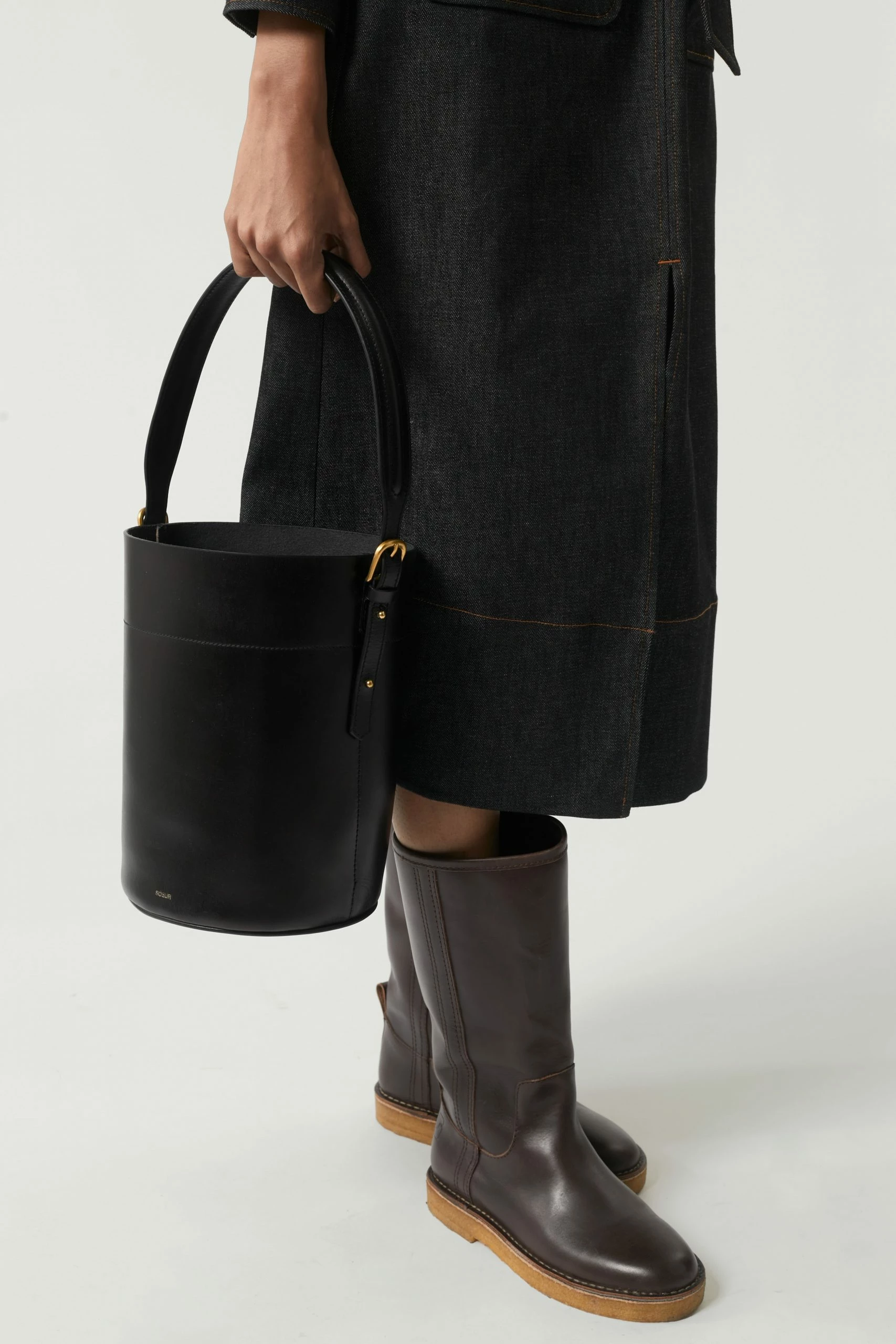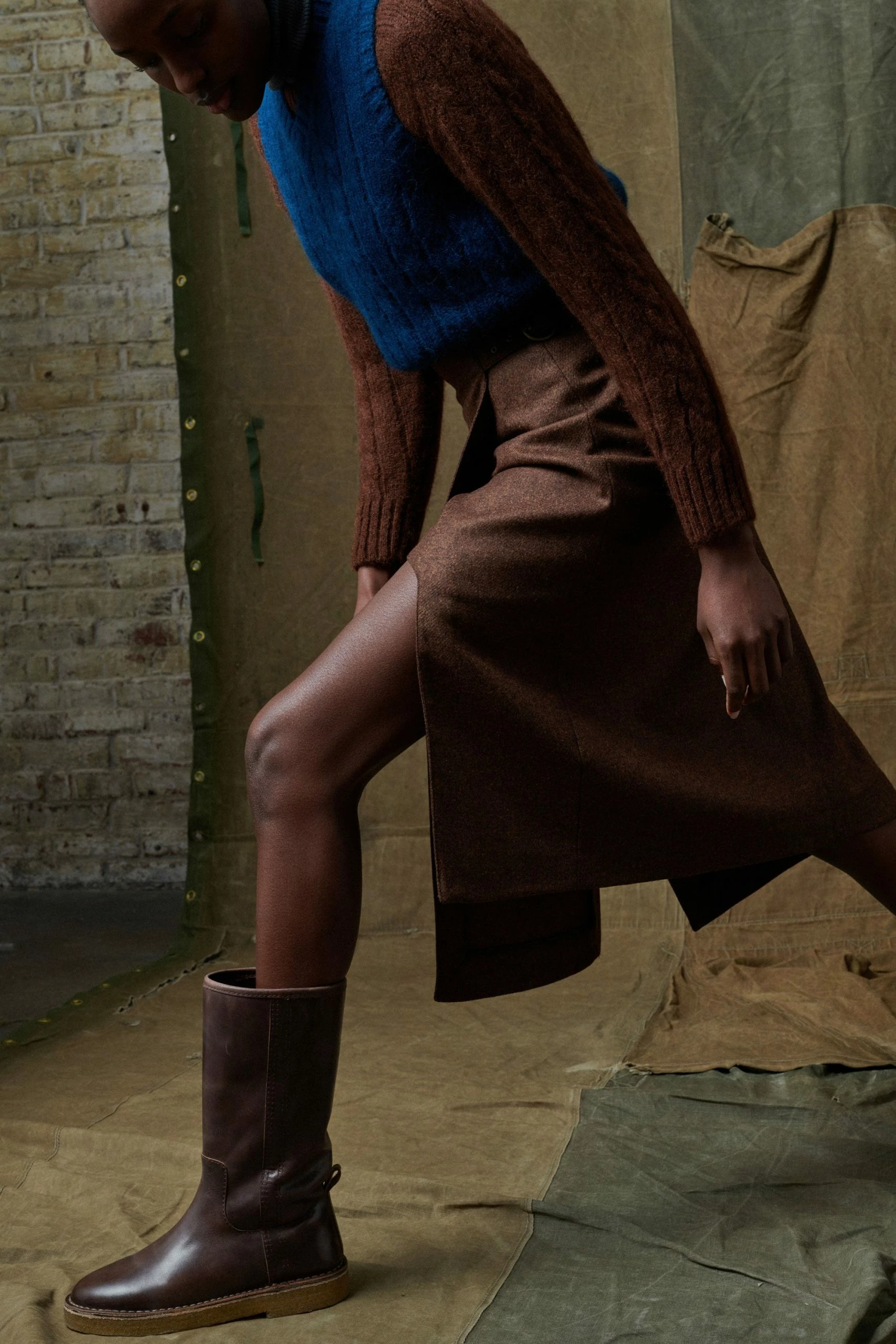 Sauvage est une nouvelle botte haute faite dans un cuir épais qui se patinera avec le temps. La semelle épaisse est en crêpe dans une couleur contrastée. Sa forme large la rend pratique à enfiler et permet aux pantalons de se rentrer facilement dedans. Elle peut aussi se porter avec des pièces plus féminines telles que des robes et des jupes.