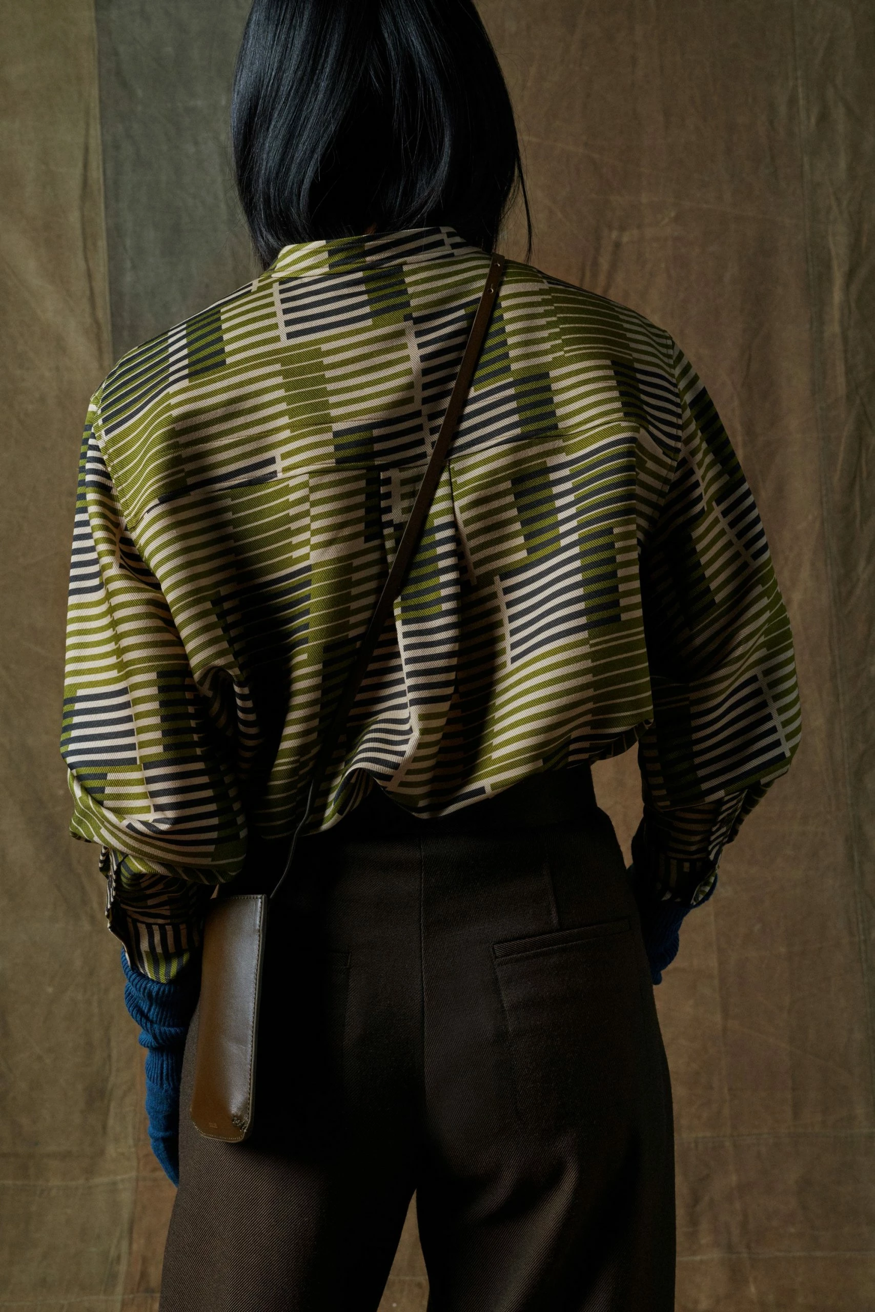 Chemise en soie imprimée kaki et écrue