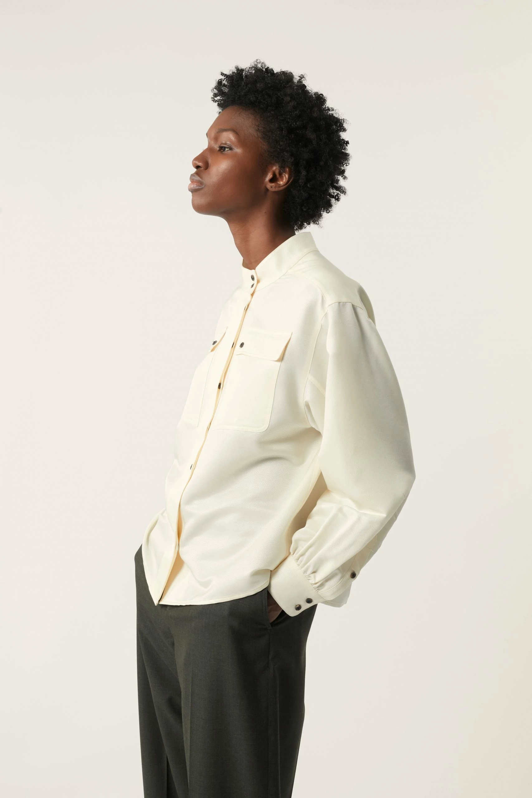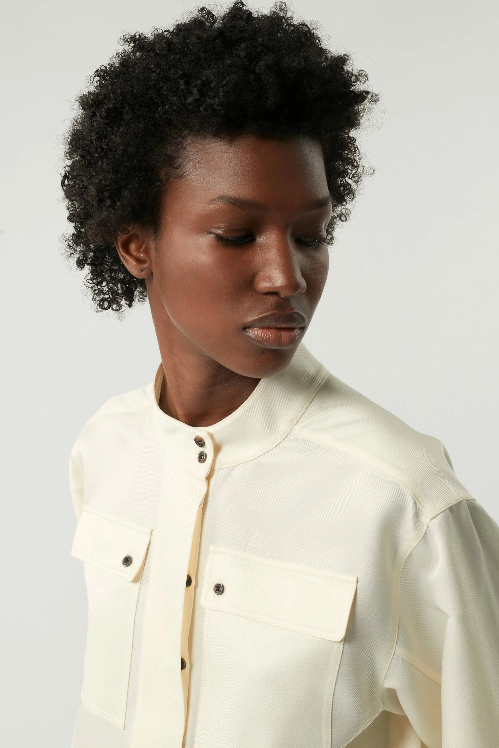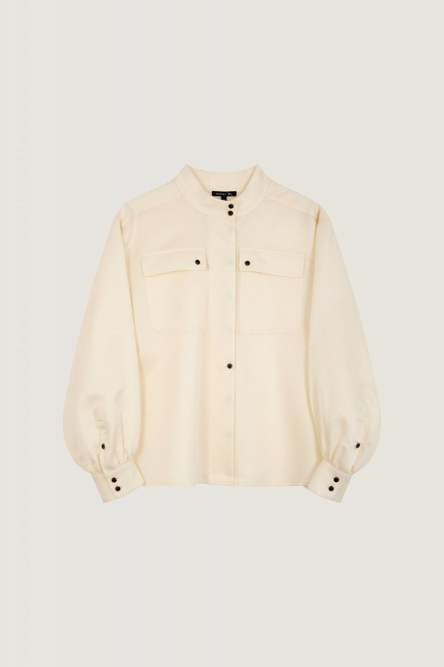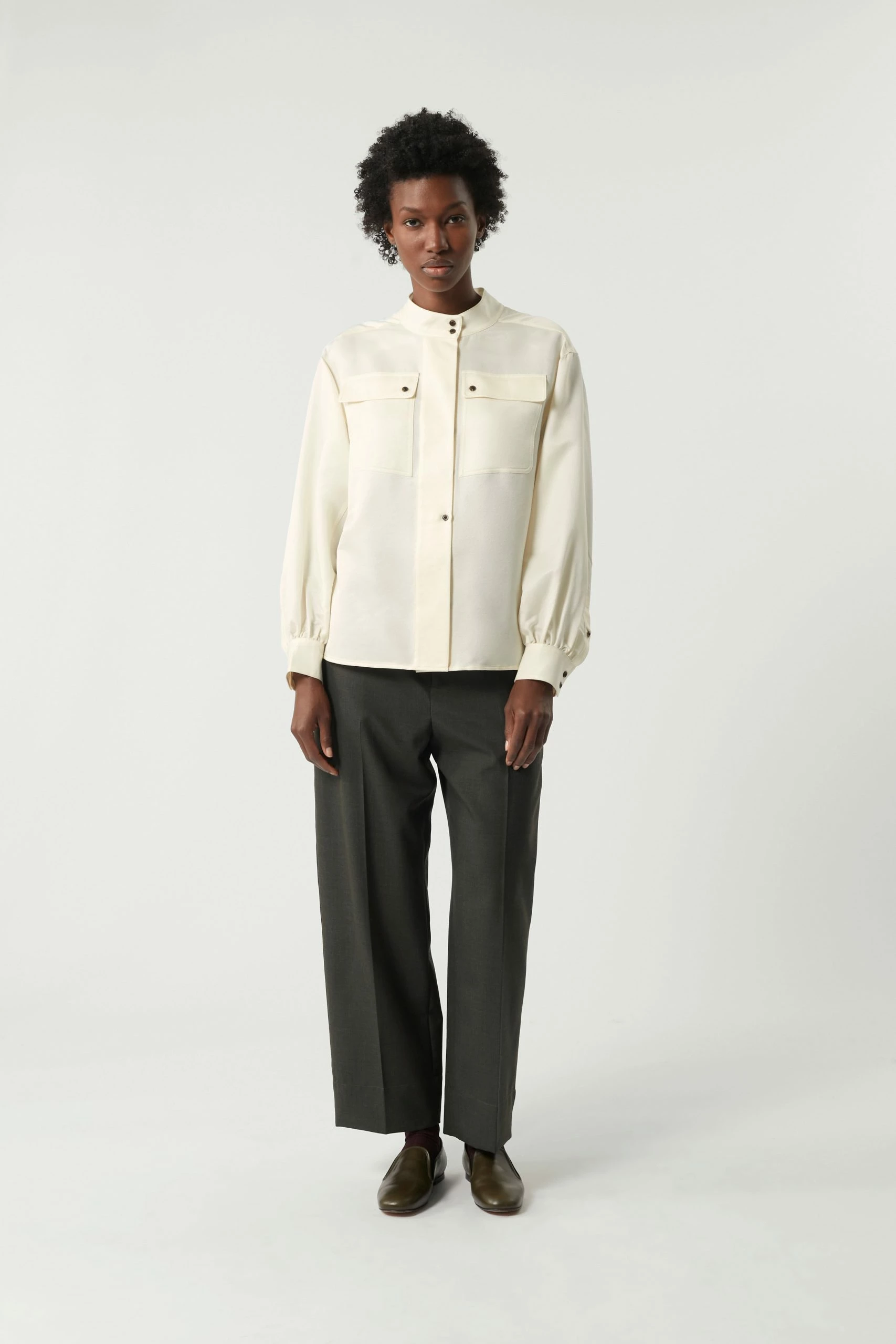 Rita est une chemise classique aux détails empruntés au vestiaire militaire. Elle est féminisée par sa matière en soie et laine qui est souple lui donnant un joli tombé. Elle arbore le col montant emblématique des collections Sœur et se ferme par une patte de boutonnage.