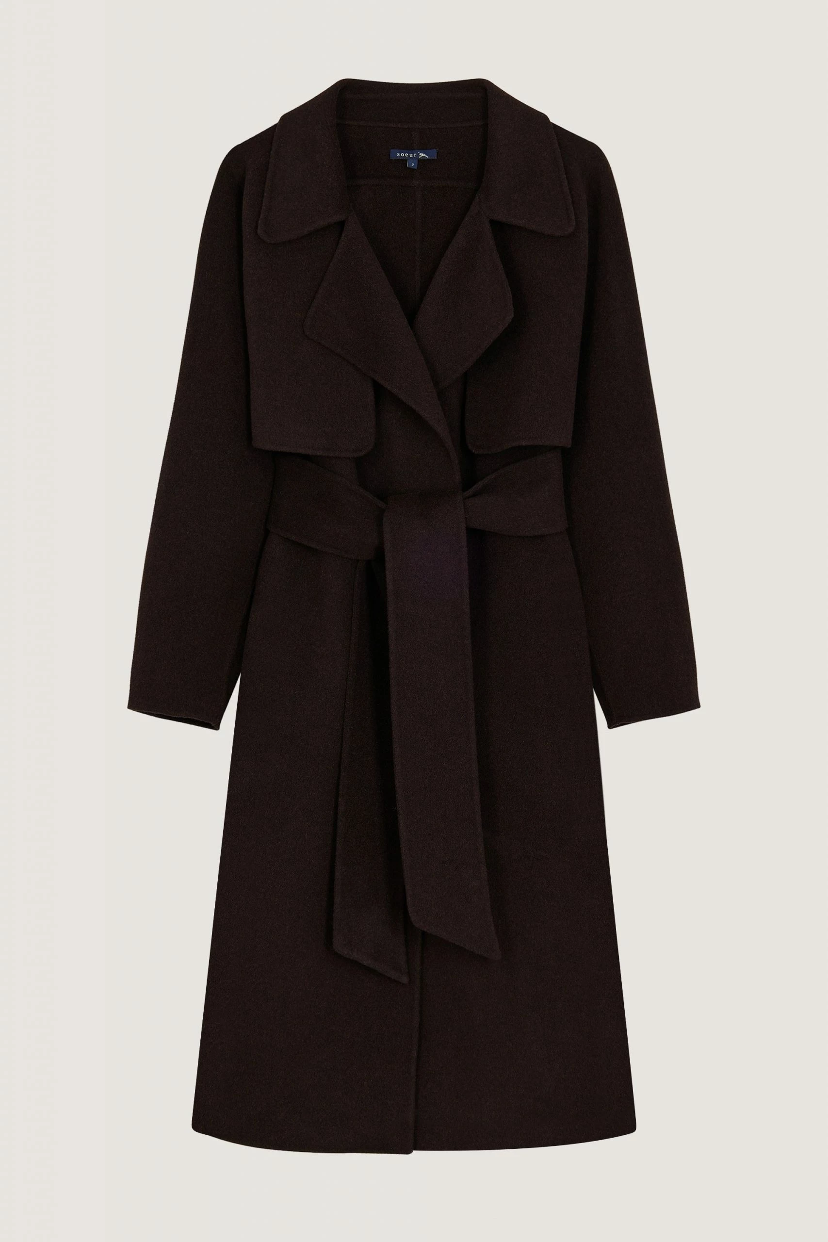 Le manteau Stalingrad reprend tous les codes d’un trench (porté croisé, ceinture, emmanchures marteau et bavolets devant et dos) sur une matière inattendue : le drap de laine double face.