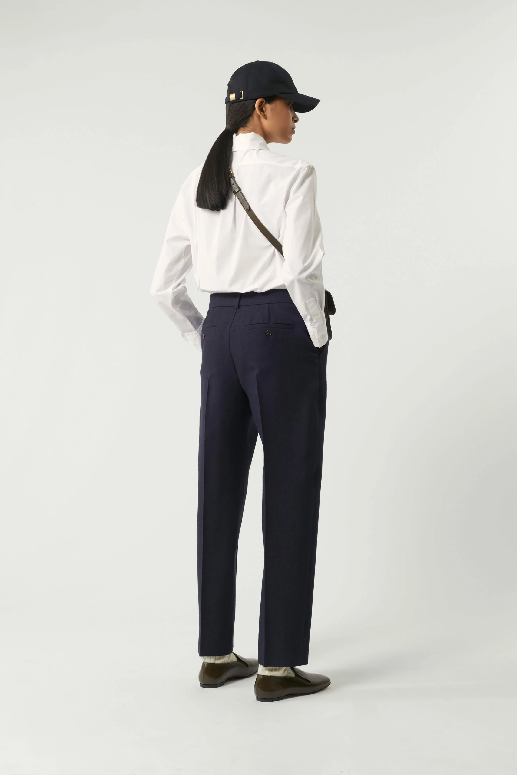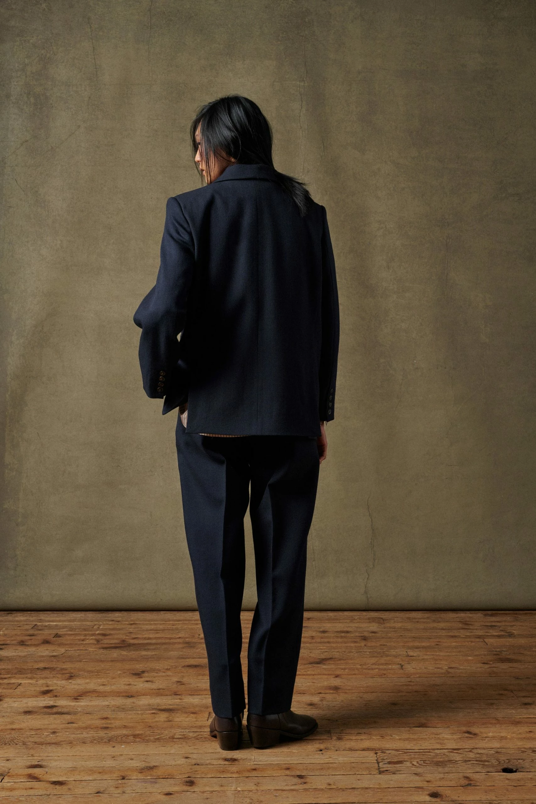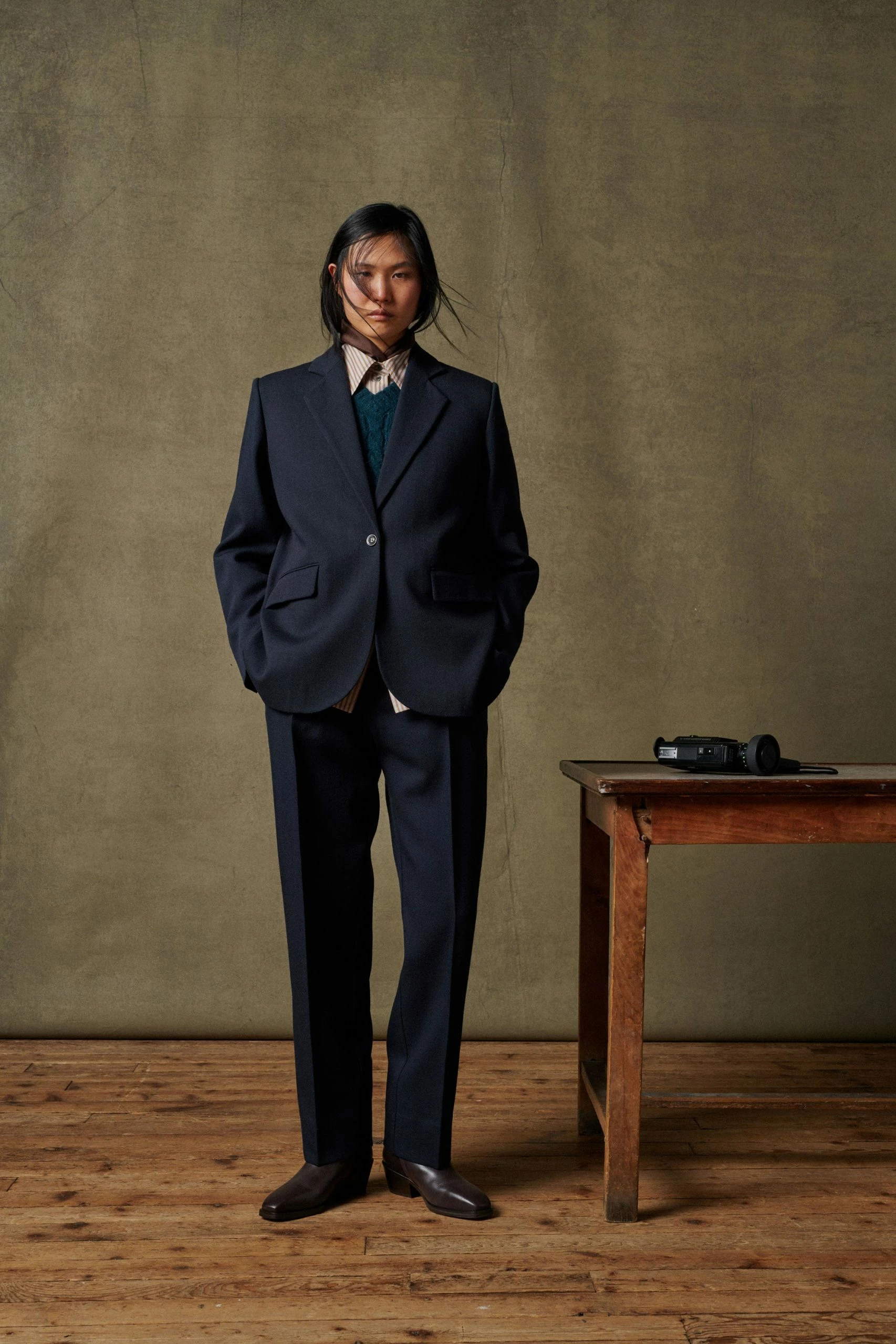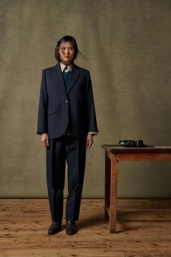 Roméo est un long pantalon à pinces sobre qui est terminé par un grand ourlet afin de laisser la possibilité d’allonger le modèle ou faire un revers. Il s’accompagne de la veste Sèvres également composé d’un sergé de laine épais et qui reprend tous les codes d’une vraie veste de tailleur.