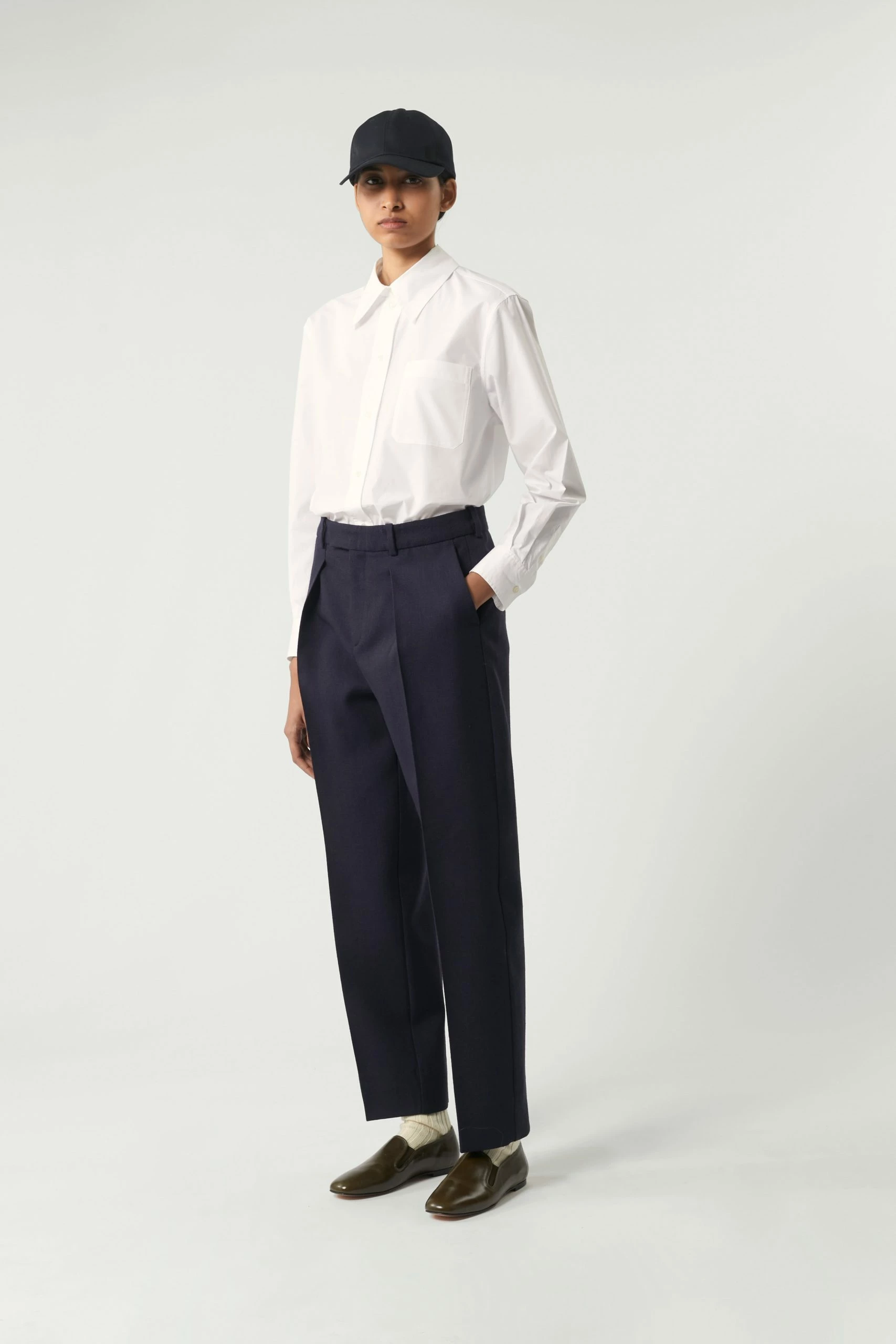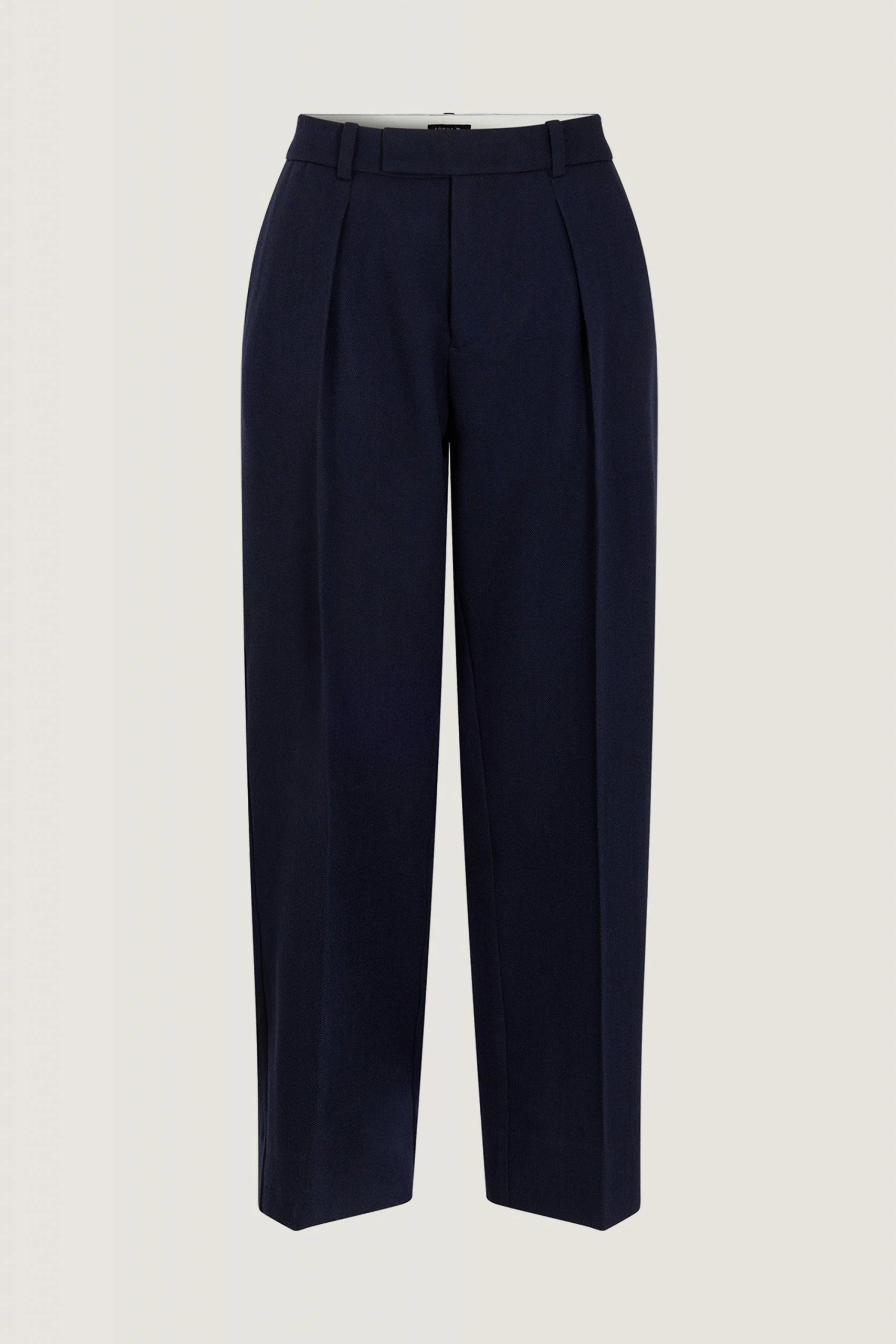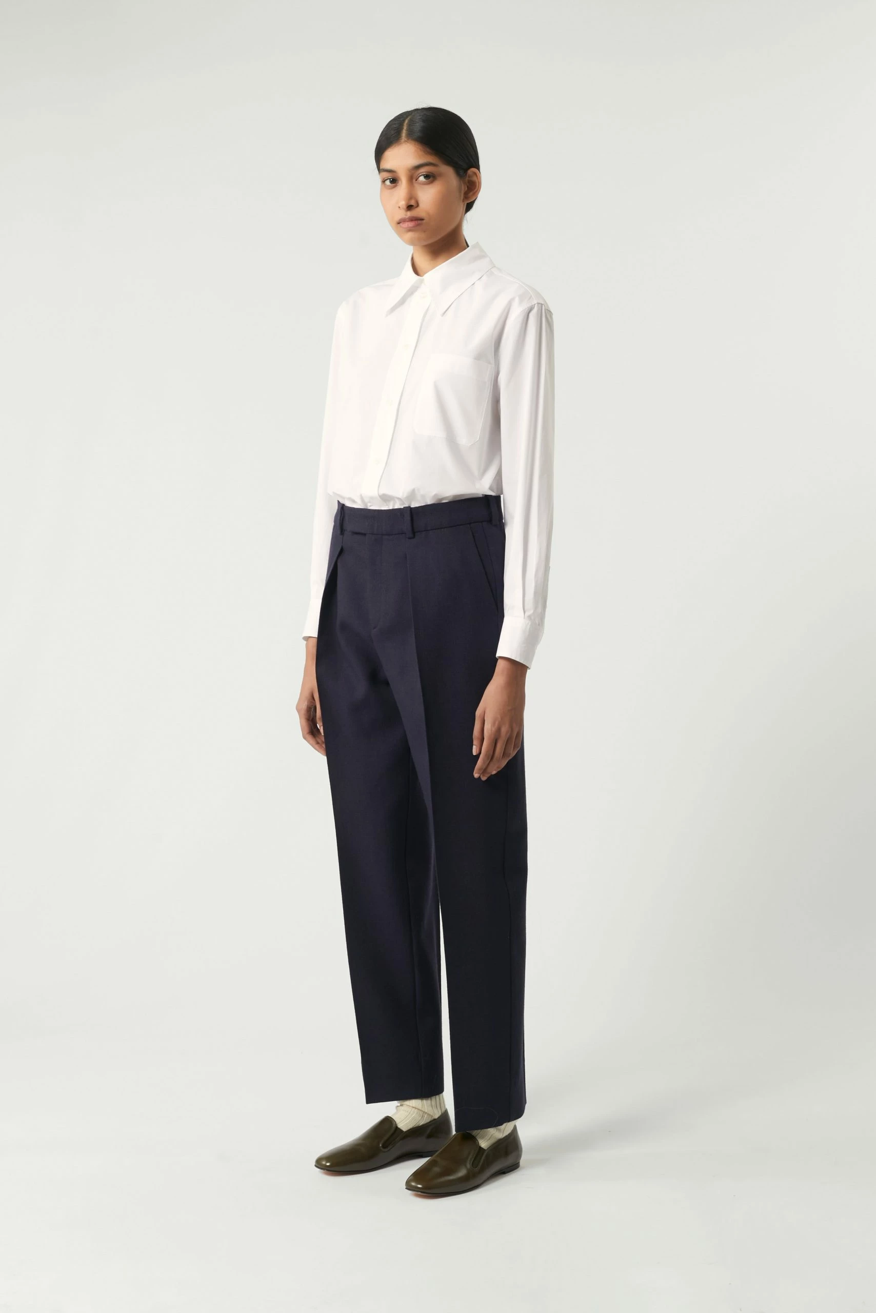 Roméo est un long pantalon à pinces sobre qui est terminé par un grand ourlet afin de laisser la possibilité d’allonger le modèle ou faire un revers. Il s’accompagne de la veste Sèvres également composé d’un sergé de laine épais et qui reprend tous les codes d’une vraie veste de tailleur.