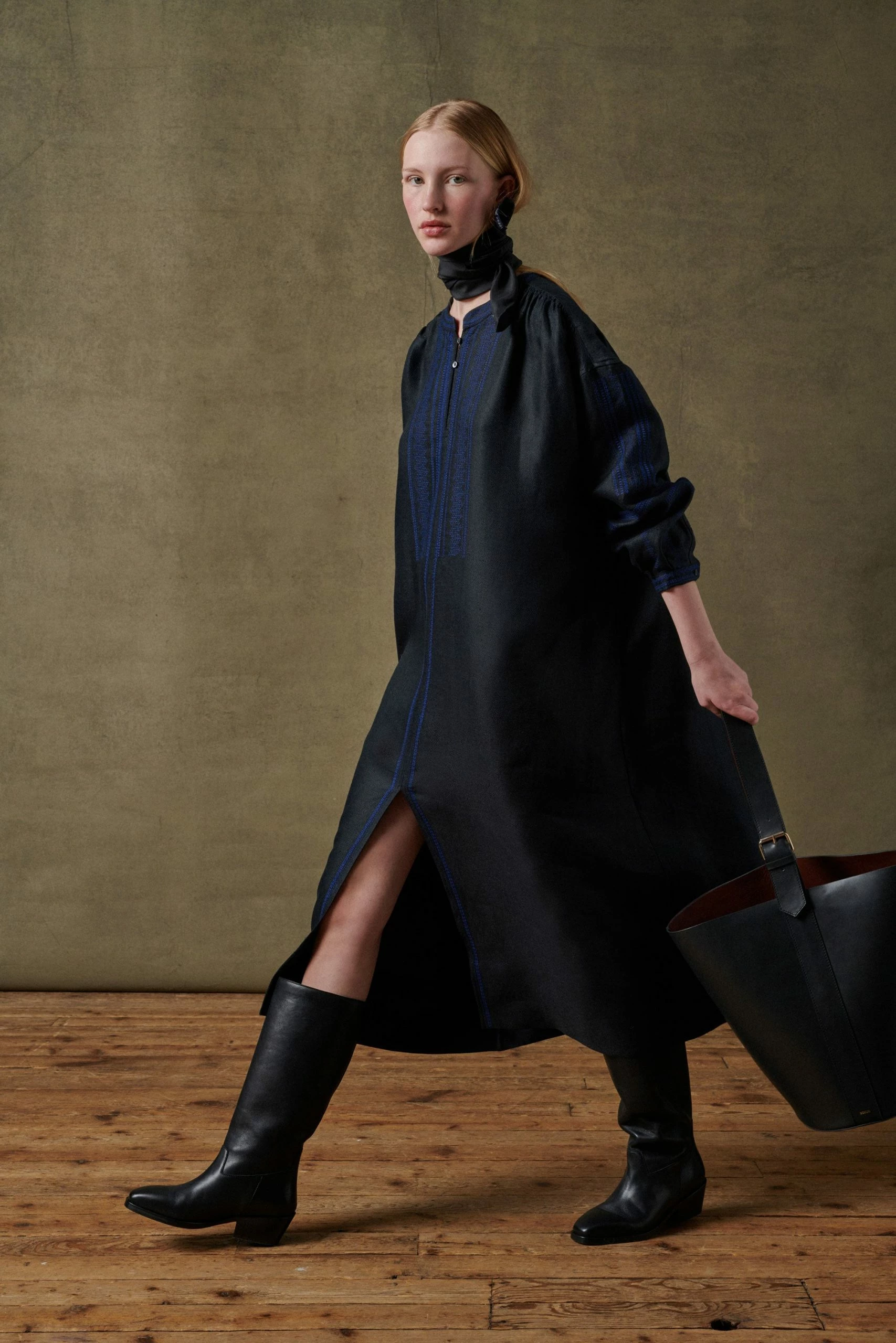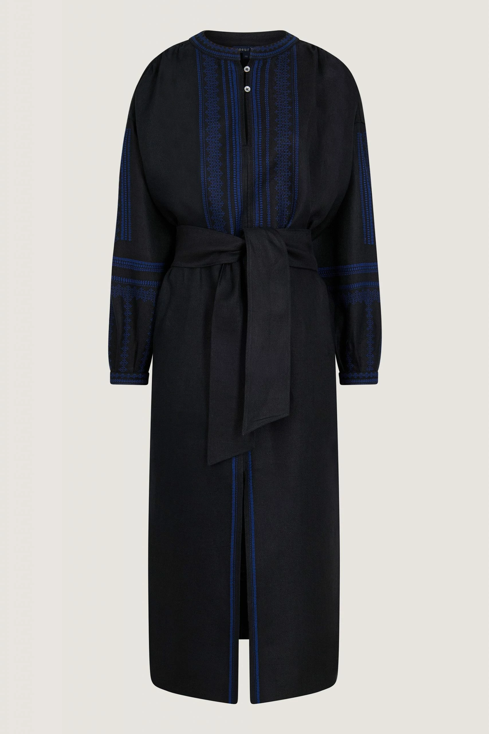 Robe noire en twill lin chintz brodée bleue