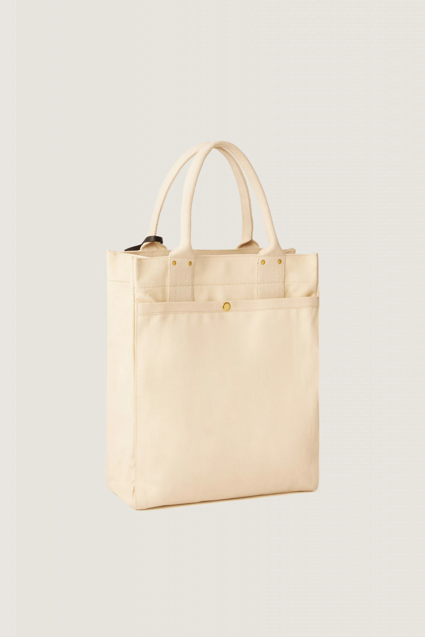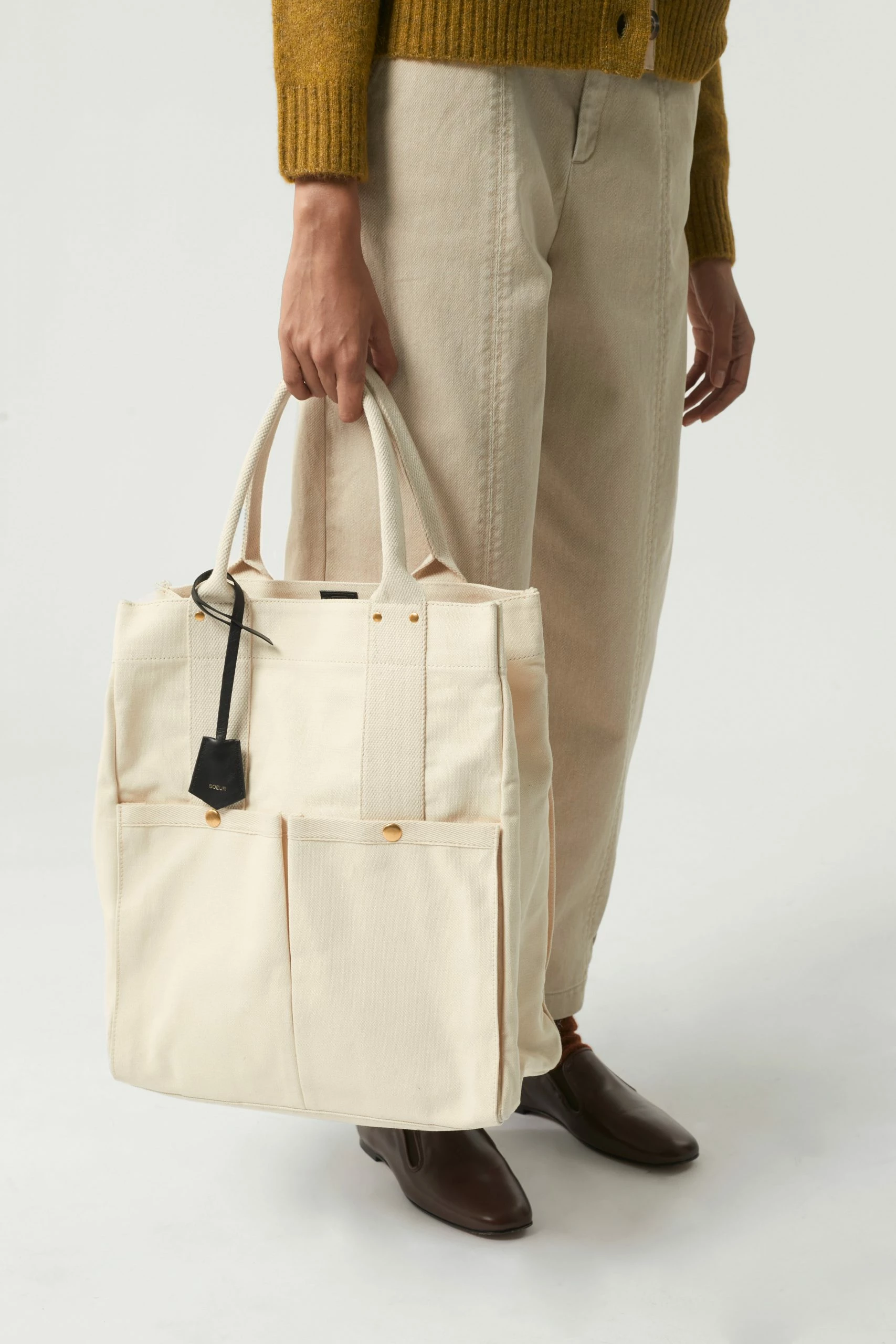 Safari est un sac cabas multipoches en toile pratique et élégant. Sa forme verticale permet de faciliter l’organisation du sac et pouvoir y mettre un ordinateur. Il se porte à la main avec les anses en coton ou en bandoulière grâce à la sangle.
